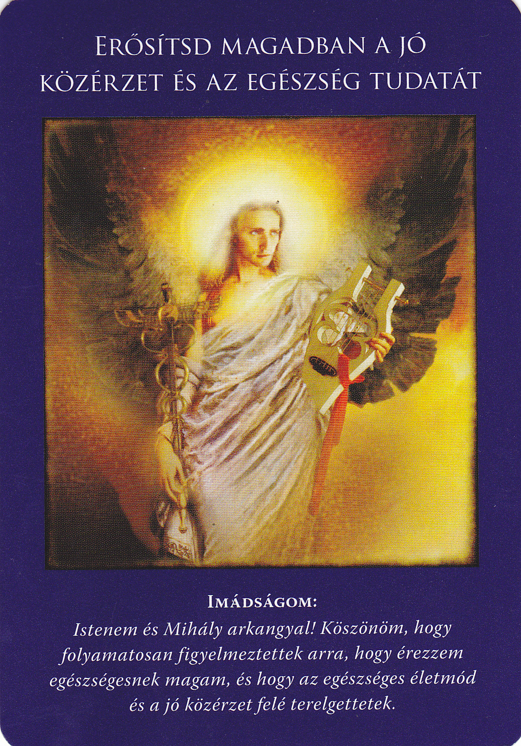 Mihály arkangyal szerint a jó közérzet és az egészség kulcsa az, ha nem a betegségre koncentrálunk. Azért húztad ezt a kártyát, hogy a félelmeid helyett a vágyaidra összpontosíts. Testünk azonnal reagál a félelemre és a szeretetre, ezért az utóbbira kell koncentrálnunk. Töltsd fel minden sejtedet gyengéd szeretettel. Képzeld el, hogy te és a környezetedben élők is mind tökéletesen egészségesek. És így is beszélj magadról és szeretteidről, mert ezzel is megerősíted azt, hogy ez valóban így is van.