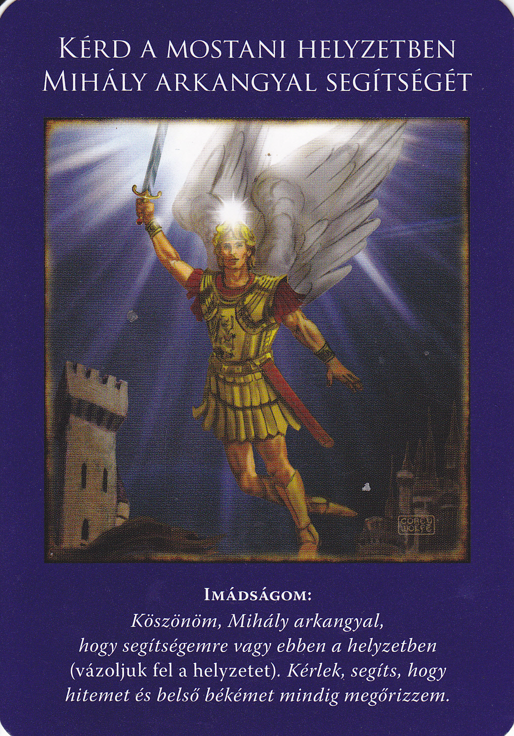 „Köszönöm, Mihály arkangyal, hogy segítségemre vagy ebben a helyzetben (vázoljuk fel a helyzetet). Kérlek, segíts, hogy hitemet és belső békémet mindig megőrizzem.”