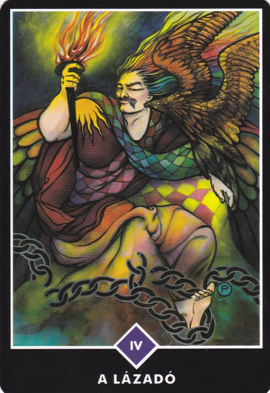 A kártyán látható erőteljes, ellentmondást nem tűrő alak nyilvánvalóan ura saját sorsának. Vállán ott a Nap jele, és a fáklya, amit jobb kezében tart, az ő saját, nehezen kivívott igazságának fényét jelképezi. Akár gazdag, akár szegény, a Lázadó valójában egy császár, hiszen szétszakította a társadalmi vélemények és beidegződések láncait, melyek elfojtáson alapulnak. Úgy formálta magát, hogy a szivárvány minden színét magához ölelte, s tudattalan múltjának sötét és alaktalan gyökereiből felemelkedve szárnyakat növesztett, hogy az ég felé repülhessen. Már létezésének minősége is lázadó - nem azért, mert valami vagy valaki ellen harcol, hanem mert felfedezte önnön igazi természetét, és eldöntötte, hogy ezentúl aszerint fog élni. Spirituális állata a sas - az ég és föld közötti hírnök.