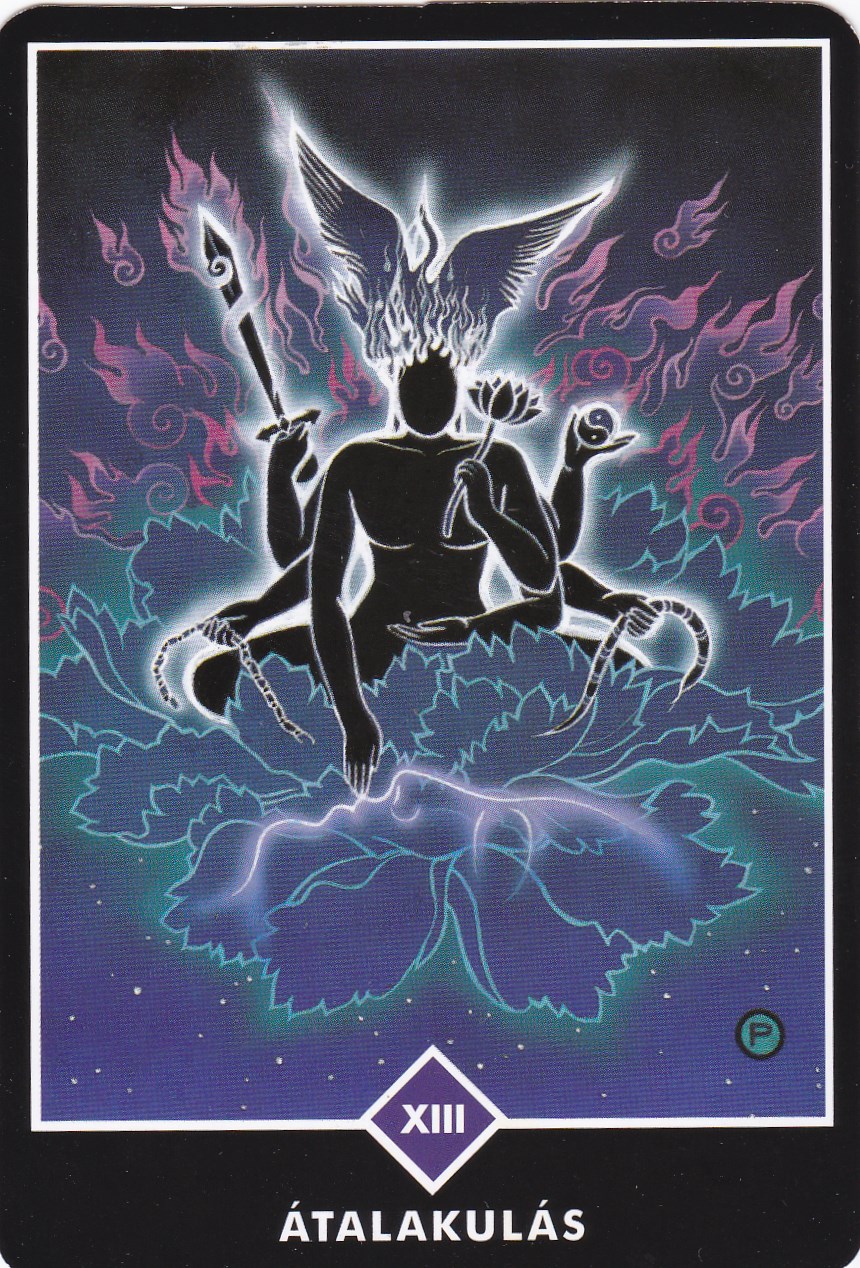 A kártya közepén látható alak az űr roppant virágának tetején ül, és kezében az átváltozás szimbólumait tartja: az illúziót kettészelő kardot, a bőrét levedlő, megújuló kígyót, a korlátok szétszakított láncát, és a kettősségen túllépő jin-jang szimbólumát. Egyik keze nyitva pihen az ölében: ez a befogadást jelképezi. Egy másik, lefelé nyúló keze pedig egy alvó alak száját érinti éppen, mellyel a nyugalomban ránk ereszkedő csöndet szimbolizálja.