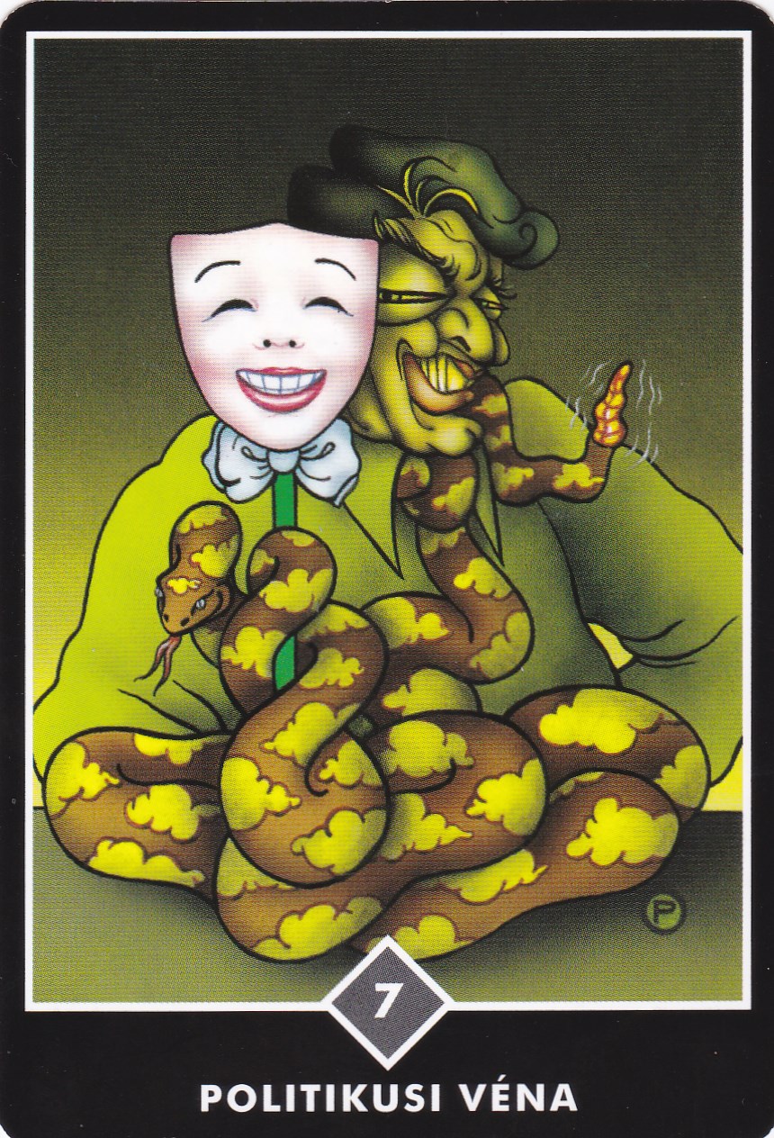 Felismered ezt az embert? Még a legártatlanabb és legőszintébb emberi elmében is ott rejtőzik valahol egy politikus. Sőt, az elme maga egy politikus. Vérében van a tervezgetés, mesterkedés, és úgy manipulálja az embereket, az élethelyzeteket, hogy mindig megkapja azt, amit akar. Itt az elmét ez a villásnyelvű, felhőmintás kígyó jelképezi. De a legfontosabb dolog, amit ezen a kártyán észre kell venni az, hogy mindkét arc hamis. A nyájas és ártatlan "bízz bennem" arc is álarc, és a gonosz, mérges "úgyis elérem nálad, amit akarok" arc is az. A politikusoknak nincs igazi arcuk. Az egész játék egy hazugság.
