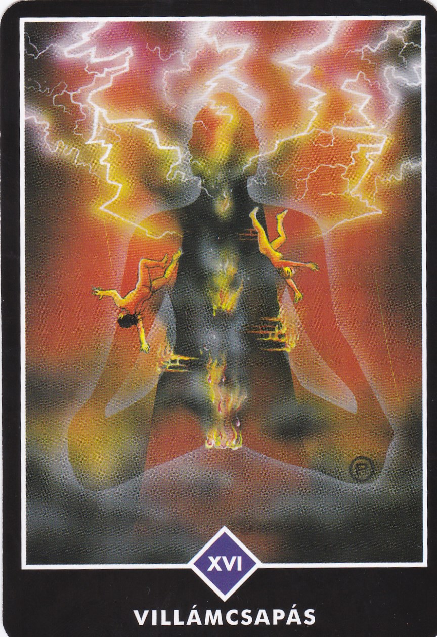 A kártya egy lángokba borult, összeomlani, megsemmisülni készülő tornyot ábrázol. Egy férfi és egy nő ugranak le róla, nem önszántukból, hanem mert nincs más választásuk. A háttérben az áttetsző, meditáló alak a szemtanúként jelenlévő tudatot jelképezi.